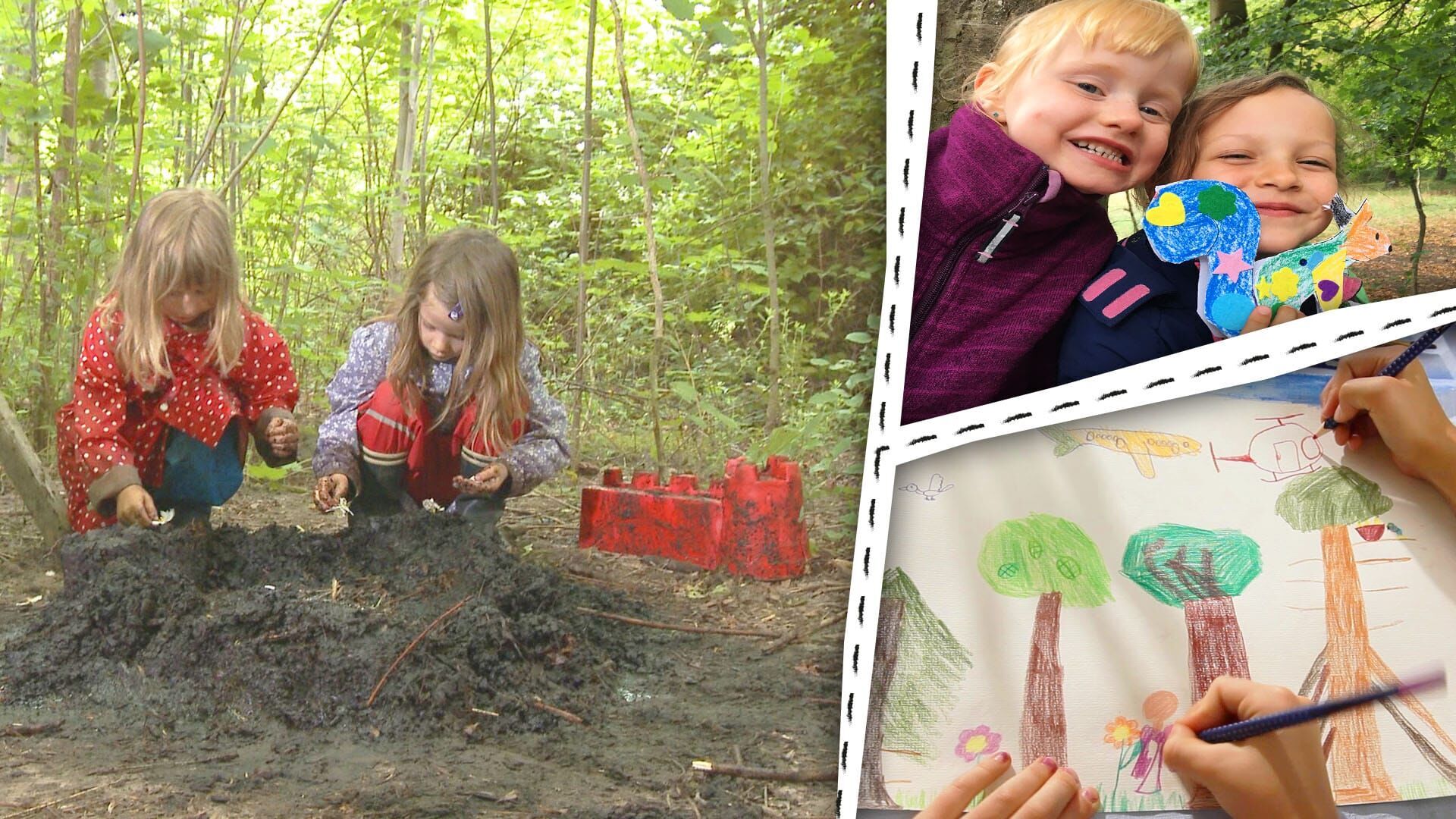 Auf in den Wald – Eichhörnchen, Waldbilder, Matschburgen: Im Wald gibt es viel zu entdecken! Yuna und Leah basteln eine Matschburg. Die schmücken sie mit Blättern und Blüten! Frieda und Julius basteln eine Steckeule. Josephine, Julieta, Evita und Minette machen einen Waldspaziergang und malen Bilder. Mach doch auch mit und male ein Bild oder bastle eine Steckfigur für die ENE MENE BU Poststation!