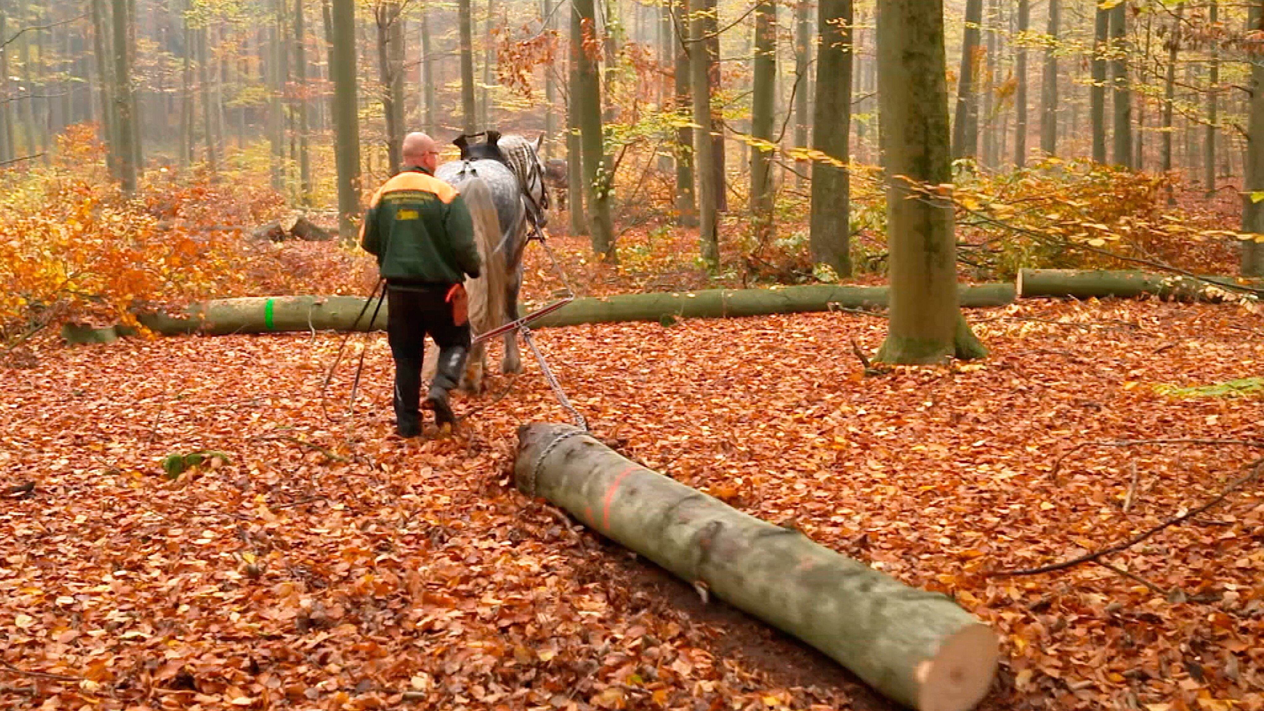 Im Herbst, wenn sich die Natur zur Ruhe begibt, wird der Wald aufgeräumt. So ist das seit Jahrhunderten. In der Schorfheide rückt Anfang November Mario Kaufmann mit seinen Kaltblütern an, um gefällte Baumstämme zum Abtransport zurechtzulegen. Ein Knochenjob – für Mensch und Tier, aber waldschonend. Dabei können die tonnenschweren Tiere sogar das Anderthalbfache ihres Gewichtes ziehen. Die Pferde lernen das bei dem 45-Jährigen, der in Blütenberg bei Werbellin seinen Hof hat. Dort züchtet er und bildet die Pferde aus. 60 schwergewichtige Tiere stehen auf den Weiden rund um Blütenberg. Aristoteles ist vier Jahre alt und wird gerade fit gemacht für den Job im Wald, zwei Jahre dauert die Ausbildung. In diesem Jahr wird er das erste Mal dabei sein. Wir lernen die Arbeit auf dem Hof kennen und sind bei der Ausbildung von Aristoteles dabei. Mario Kaufmann ist ein erfolgreicher Züchter, der viele Auszeichnungen für seine Tiere bekommen hat.