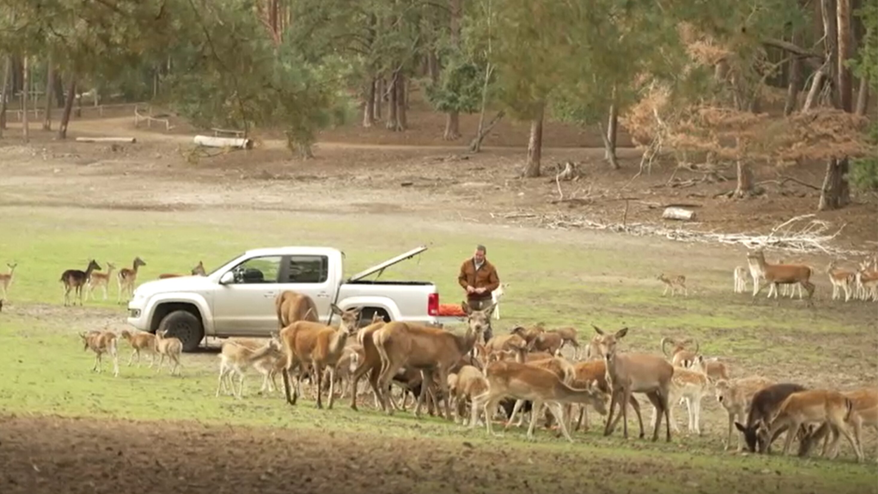 Die Brunft ist das besondere Ereignis im Frühherbst, dann röhren die Hirsche und buhlt das Wild, die Wölfe heulen und die Wisente preschen kraftdonnernd über den Platz. Nur bei den Bären wird es ruhiger, sie bereiten sich auf den Winterschlaf vor und haben eine Bärenhöhle gegraben. Seit 25 Jahren existiert der Wildpark Johannismühle zwischen Berlin und Cottbus und wird seit drei Jahren von Jan Tayeb mit seiner Frau Sophie geleitet. 250 Tiere leben hier, darunter vor allem Damwild – besondere Attraktion sind Bären und Wölfe. Am Tage können Besucher auf dem Gelände hautnah die Fütterung erleben, denn Zäune gibt's hier keine, außer bei den Raubtieren. Die Fütterung, rund um die Mittagszeit, ist ein Spektakel, denn die sonst so scheuen Waldtiere bekommt man in freier Wildbahn sehr nah zu sehen. Josephine Stubbe, die Falknerin, macht ihre eigene Show: Die Flugshow mit Eulen, Adlern und Falken. Bevor die Tiere in der täglichen Vorführung mit ihren Flügelschlägen das Publikum begeistern, müssen sie erst trainiert werden. Ein Besuch im Wildpark Johannismühle mit Tanzbären, Nachteulen und Platzhirschen.