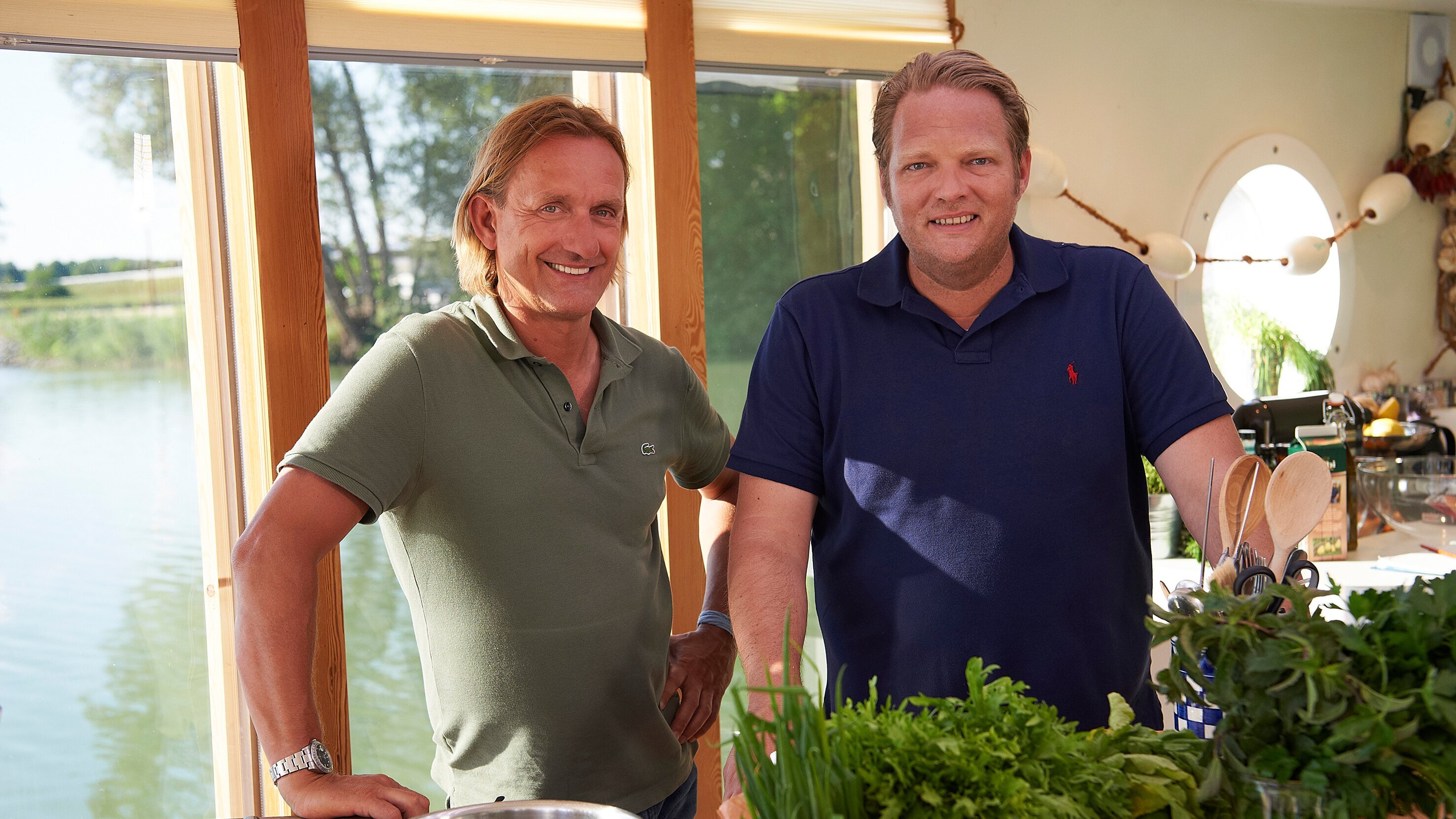 Kulinarische Schätze rund um Mondorf Im diesem Sommer sind die Spitzenköche und Freunde Björn Freitag und Frank Buchholz unterwegs auf großer Entdeckungstour entlang des Rheins. Vom Siebengebirge bei Bad Honnef durch die Kölner Bucht entlang des Niederrheins bis Emmerich an der niederländischen Grenze. In der zweiten Folge müssen Skipper Heinz-Dieter Fröse und die beiden Köche erst einmal Nerven bewahren: Die unaone hat einen Getriebeschaden und ohne fremde Hilfe kommt sie nicht mehr vom Fleck. Schlepper "Doris" bringt die drei Freunde erstmal in den nächsten Hafen nach Mondorf. Dann geht es mit den E-Bikes an Land, um regionale Produkte zu entdecken und abends wenigstens mit einem guten Essen den "Pannen"-Tag zu beenden. Björn fährt durchs Siebengebirge und kommt nach Königswinter-Dollendorf. Hier darf der Bio-Winzer Kay Thiel bei seiner Arbeit in den Weinbergen unterstützen. In Rösberg trifft Frank unterdessen die Ziegenhof-Betreiberin Ilona Kuhnen. Als Stadtkind hat sie sich ihren Jugendtraum vom Landleben mit Tieren erfüllt. Frank wird bei einer Ziegen-Massage einmal kräftig durchgeknetet und darf dann mit Ilona an einer neuen Frischkäsevariante feilen. Unterdessen ist Björn zu Besuch bei Gabriele Rengel-Schneider und ihrem Mann Volker. Das Paar hat sich in einem alten Arbeitergarten am Heider Bergsee eine Oase erschaffen. Björn freut sich bei der Ernte besonders über die dicken Bohnen. Franks letzte Station ist der im südlichen Bonn gelegene Leyenhof. Mitbegründer Helgo Schmidt führt Frank durch den Betrieb und versucht Frank für Rote Melde und Catalogna zu begeistern. Zurück an Bord wird heute rein vegetarisch gekocht. Frank bereitet nach eigenem Spezialrezept frische Nudeln mit Auberginenwürfeln, Catalogna und Ziegenquark zu. Björn zaubert ein Paprikaschaumsüppchen mit Pesto-Topping und als leckeres Dessert gibt es Eischnee mit Baiserkrümeln und "beschwipsten" Himbeeren. Und dann heißt es erstmal: "Warten auf das Ersatzteil und immer die Ruhe bewahren!"